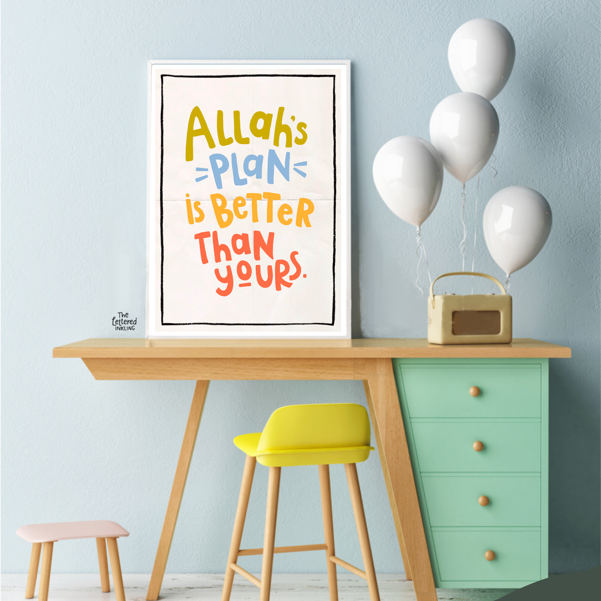 A bold typography of the reminder ‘Allah’s plan is better than yours’, perfect for encouraging young ones no matter the consequences. Suitable for older and younger kids as well as adults.